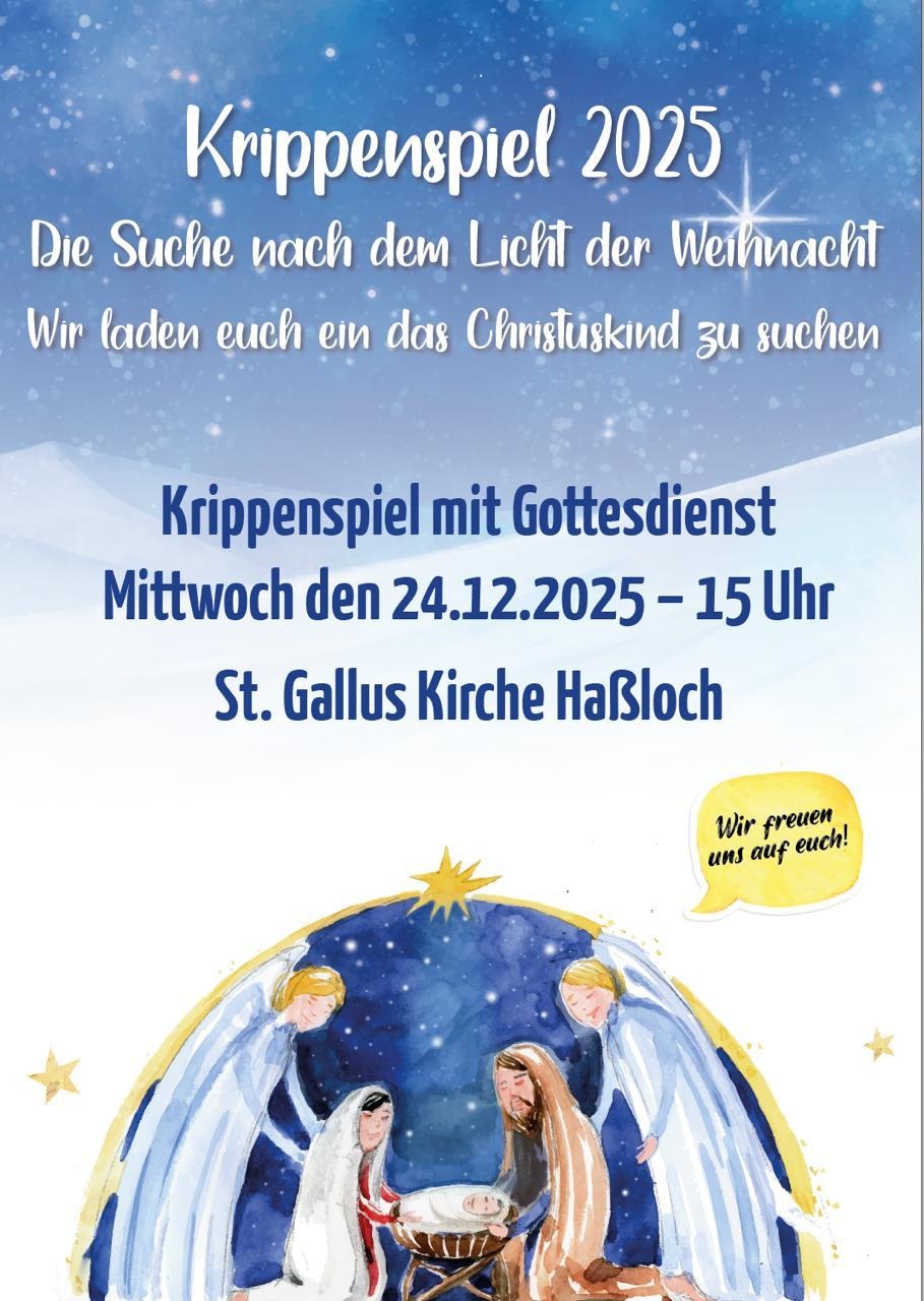 | Mi | 24.12. | Kath. Kirche St. Gallus, Haßloch | 15:00 | Krippenfeier |