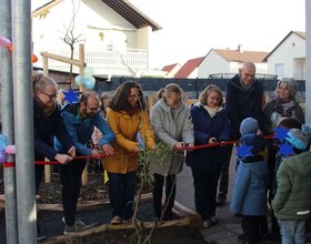 Nach kurzen Ansprachen durch die stellvertr. Kita-Leitung Marion Strauß und Stephanie Klahn, Vertreterin von Förderverein und El-ternausschuss, sowie die Segnung durch Matthias Aperdannier schnitten Vertreter*innen der „TaskForce Naturspur“ symbolisch das Band