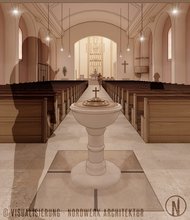 Eine weitere sichtbare Änderung wird die Gottesdienst- und Kirchenbesucher/-innen unmittelbar beim Betreten des Kirchenraumes erwarten. Das bislang in der Seitenkapelle platzierte Taufbecken wird im Eingangsbereich unter der Empore einen neuen Platz finden und als nutzbares Weihwasserbecken beim Ankommen an die eigene Taufe erinnern (siehe Visualisierung). Durch das Herausnehmen der jeweils letzten beiden Kirchenbänke, sowie durch zusätzliche Sitzgelegenheiten in Form von Sedilien wird zudem die Möglichkeit geboten, rund um das Taufbecken Tauffeiern zu begehen.