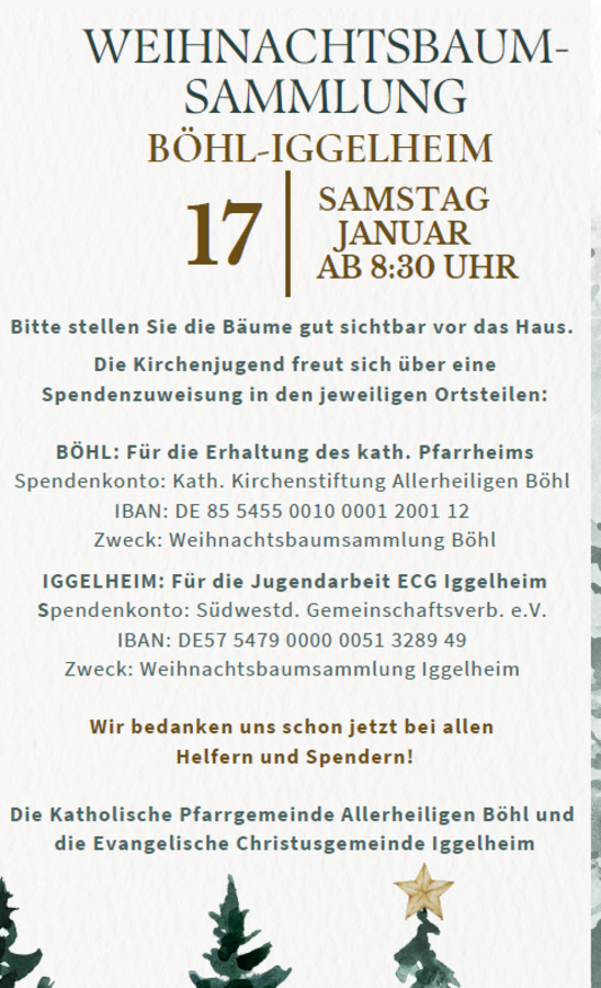 Böhl und Iggelheim. Sa 17.01.2026, ab 08:30 - Bitte stellen Sie die Bäume gut sichtbar vor das Haus. Die Kirchenjugend freut sich über eine Spendenzuweisung